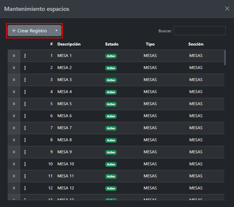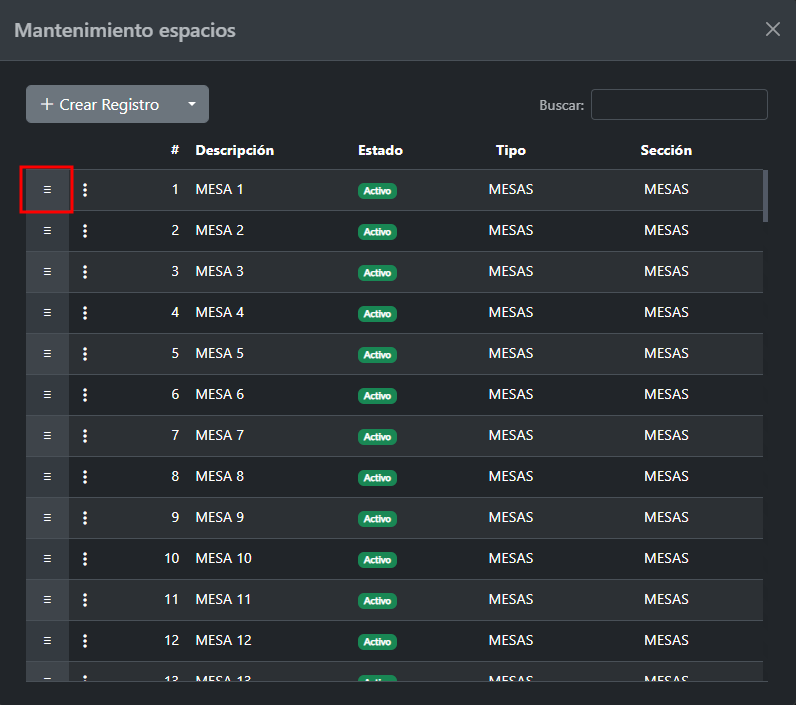 Para modificar espacios, es en la misma ventana en «Mantenimientos» y «Mantenimiento Espacios».