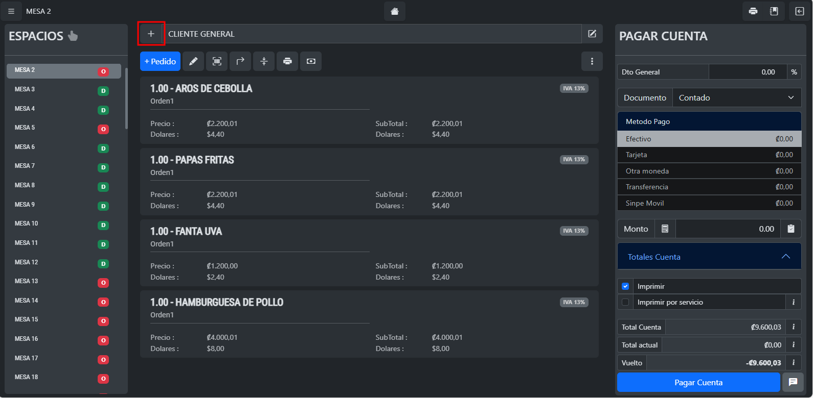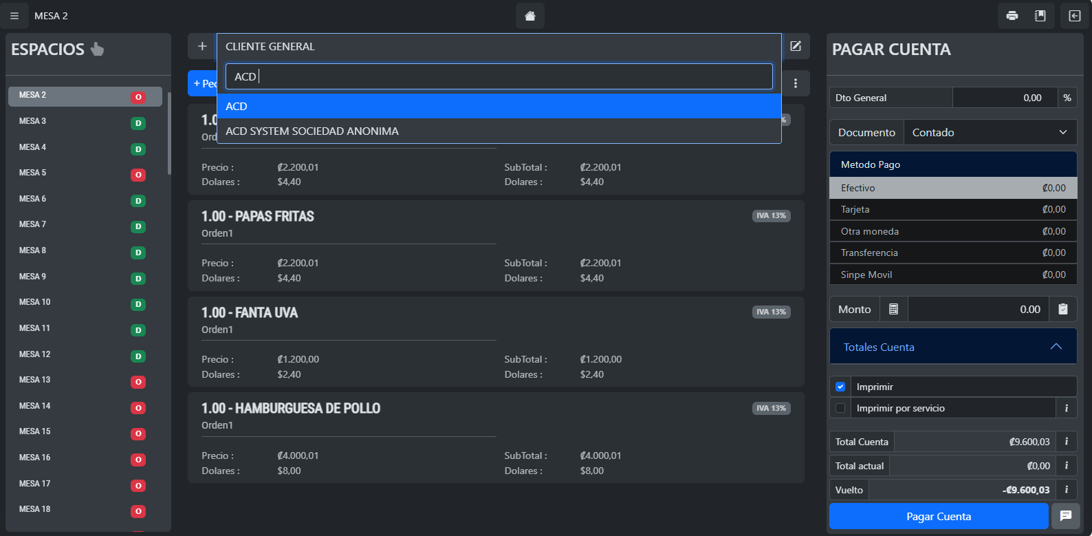 Si presiona sobre la barra donde aparece el nombre del cliente, en este caso, CLIENTE GENERAL, aparecerá una barra de búsqueda donde puede digitar el nombre para buscar entre clientes ya registrados.