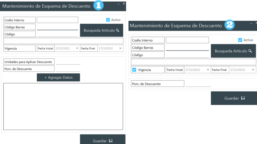 - Promocionales: descuento que se limita por tiempo, el cual se establece al articulo y se limita en el tiempo. (Se agrega la fecha de inicio y la fecha final)
