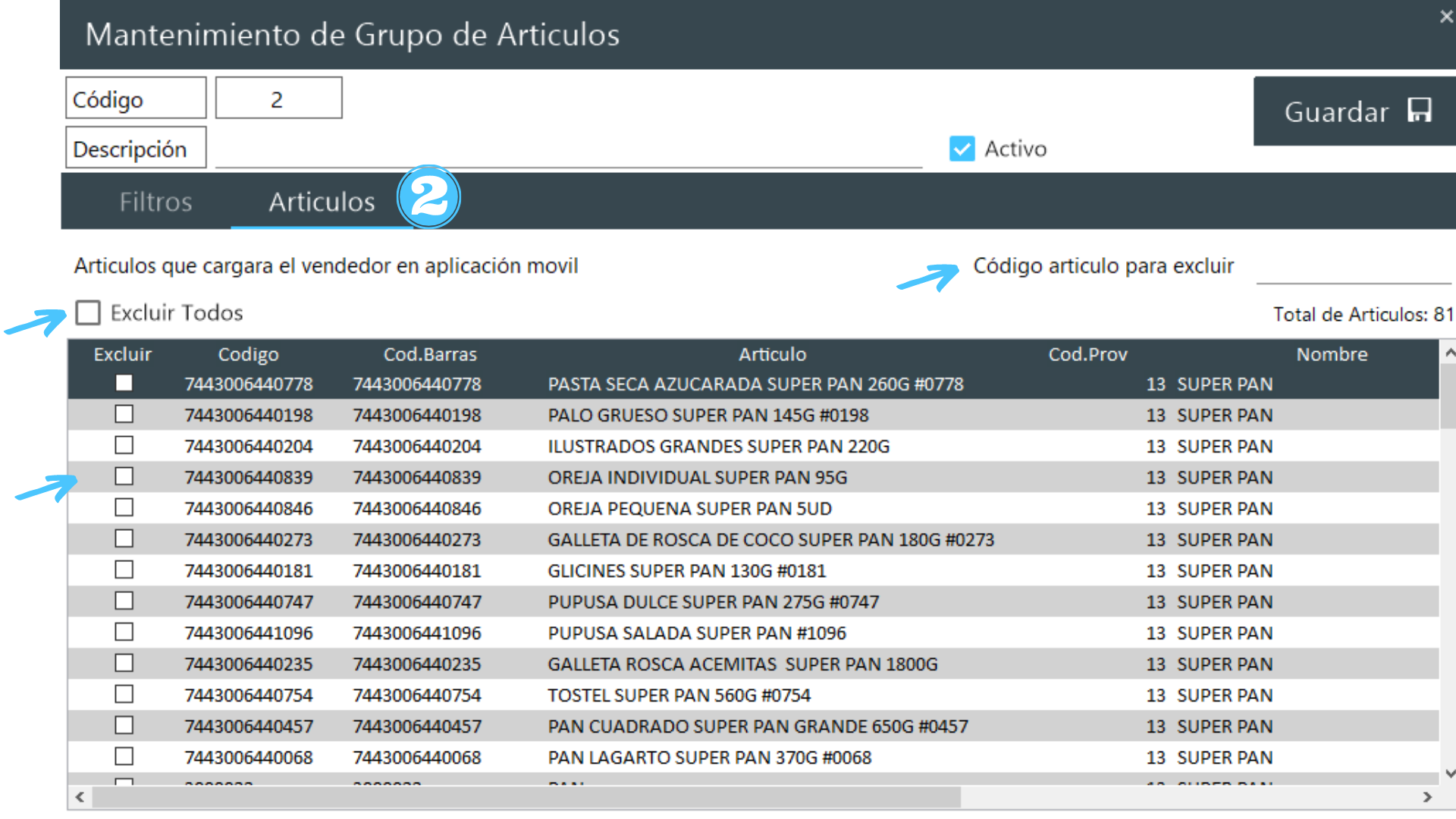 La primera columna el titulo se llama «Excluir» el usuario de oficina debe marcar la casilla para que el articulo no se agregue al grupo de artículos.