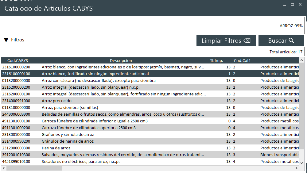 Si cuenta con el código, escríbalo o péguelo en la sección de Cod. CABYS, de lo contrario utilice el espacio de Descripción para buscar  el articulo. Por ejemplo, en el caso del Arroz , salen 17 códigos que se podrían utilizar, se debe elegir el que se asemeje más al producto y se presiona doble clic para agregar.