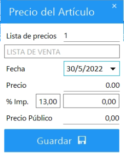 • Precio Publico: monto vigente del articulo para facturar el cual incluye el impuesto. Monto final.