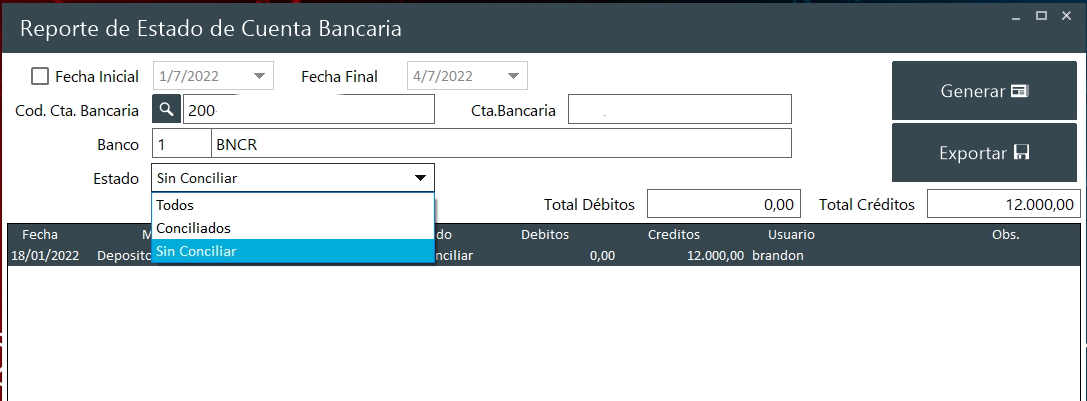 Este reporte le indica al usuario cuales son los documentos que están conciliados y que faltan por conciliar.