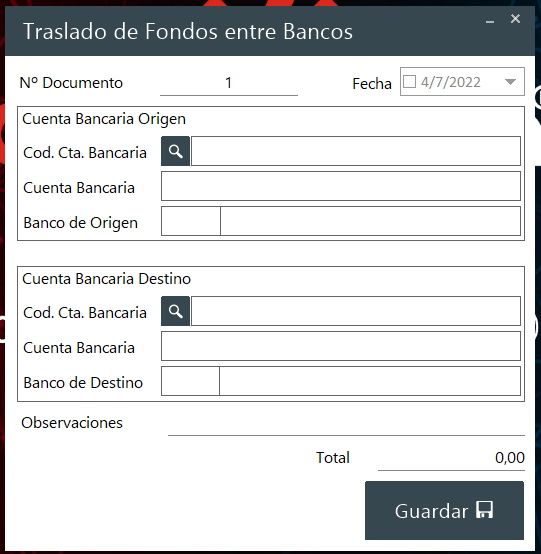 Cuando la empresa cuenta con diversas cuentas bancarias es muy común que mueva dinero de una a otra cuenta. Esta ventana esta diseñada para que el usuario pueda crear un registro de estos movimientos en el sistema.