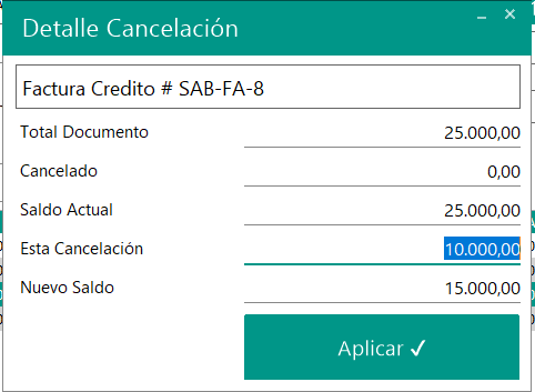 En la linea del doc de apartado presione doble clic y el sistema mostrara la ventana de «Detalle Cancelación» para agregar el abono. Este se debe ingresar en el espacio Esta cancelación.