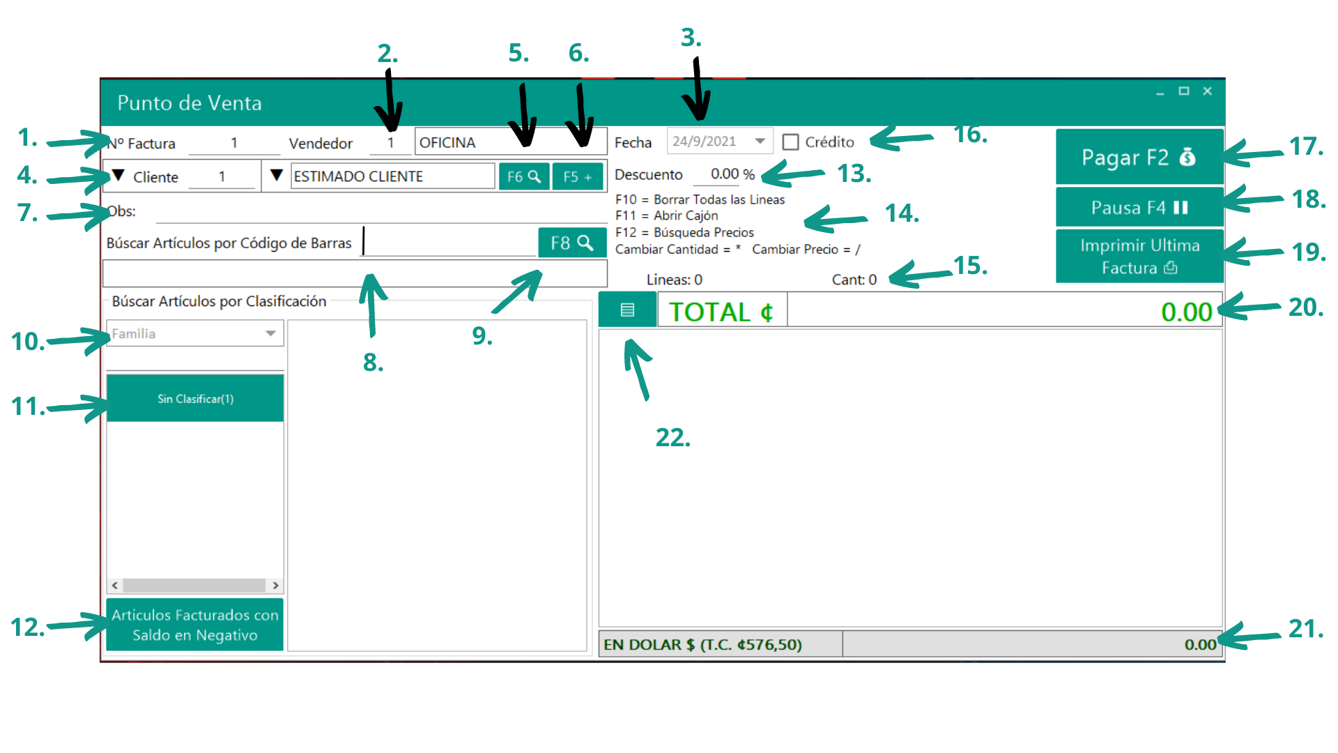 14. Sección informativa: el sistema le muestra al usuario cual es la función de las teclas rápidas en el sistema.
