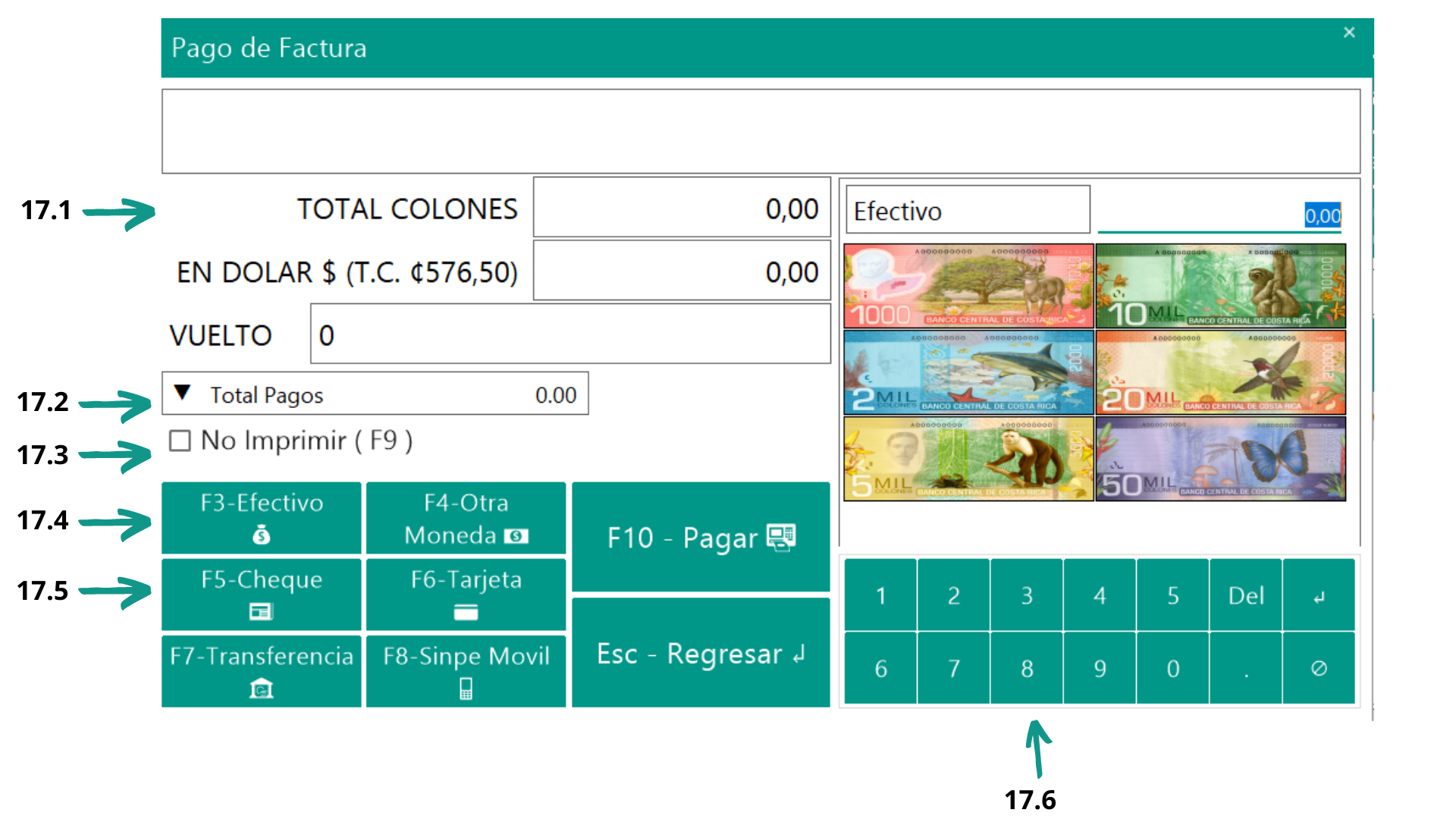 17.6 Esta sección esta creada para las empresas que cuentan con una  pantalla táctil, el usuario podrá utilizar los números para escribir el monto con el que el cliente le cancela la cuenta/factura. También se puede utilizar con el cursor del mouse.