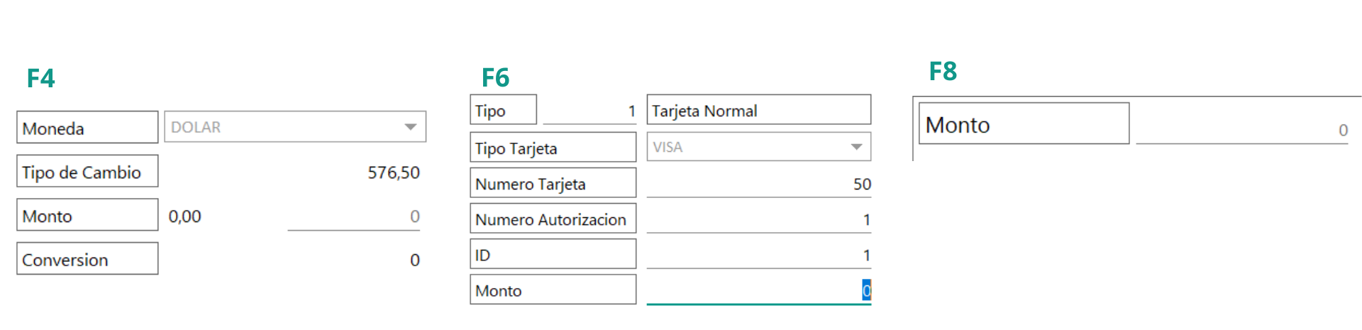 F5 Cheque, F6 Tarjeta, F7 Trasferencia: Cuando se elija esta opción el sistema registra una entrada de dinero por medio de tarjeta a pesar de que se use la opción de cheque o trasferencia. Estos montos de dinero se cargan al cierre de caja.