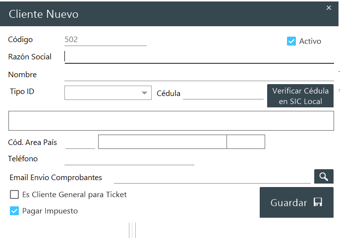 Casilla Pagar Impuesto: de una manera rápida el usuario puede desmarcar la opción para elegir que el cliente no paga impuesto. De lo contrario puede dejarla marcada si este si paga impuesto.