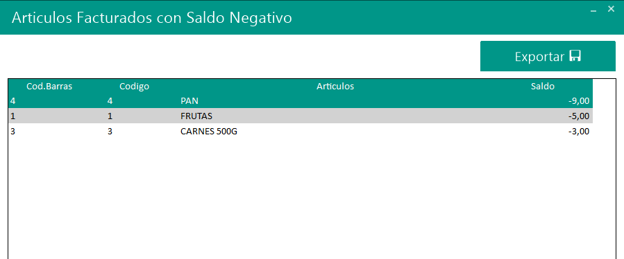 Esta opción genera un reporte de los artículos que se facturaron en el día los cuales no tenían saldo. Este reporte le ayuda al usuario ajustar el inventario y revisar las existencias de esos productos, el cual  puede exportar a Excel.