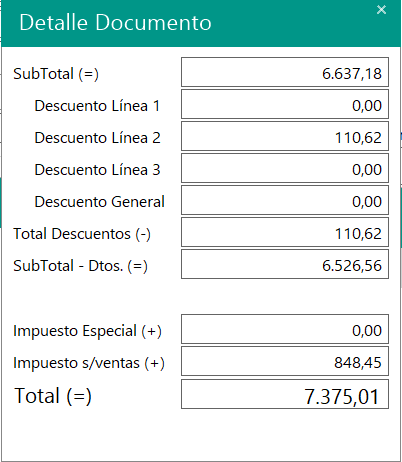 1. Detalle Documento: Esta ventana muestra  el detalle de todo el documento, descuentos aplicados, el IVA de los artículos, impuesto especial, subtotal y total de la factura.