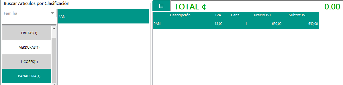 Después de seleccionar la opción de familia, marca o categoría, el sistema mostrará en el recuadro de la izquierda los artículos que tenga la clasificación asignada, en este ejemplo se le dio doble clic a la Familia de Panadería y  sucesivamente se desglosa los artículos incluidos en esa opción, en este caso se muestra el articulo de «pan», cuando se le presiona doble clic se agrega a la factura.