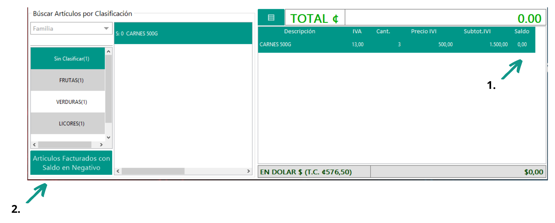1. SALDO: Esta opción muestra al usuario el saldo real de cada uno de los artículos que esta agregando a la factura.