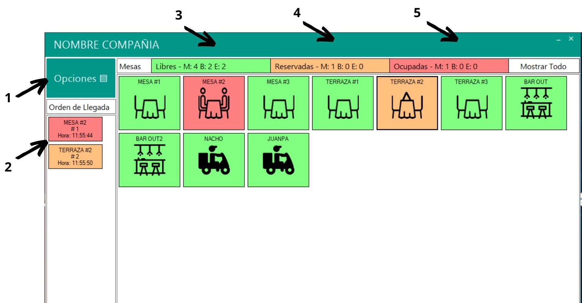 Orden de llegada: puede observar  en esta sección cuales son las mesas, barra y exprés que están ocupadas y/o reservadas, cual número de mesa se atendió primero, a que hora se dio el inicio de su pedido y cuanto tiempo lleva una mesa reservada sin ser ocupada.