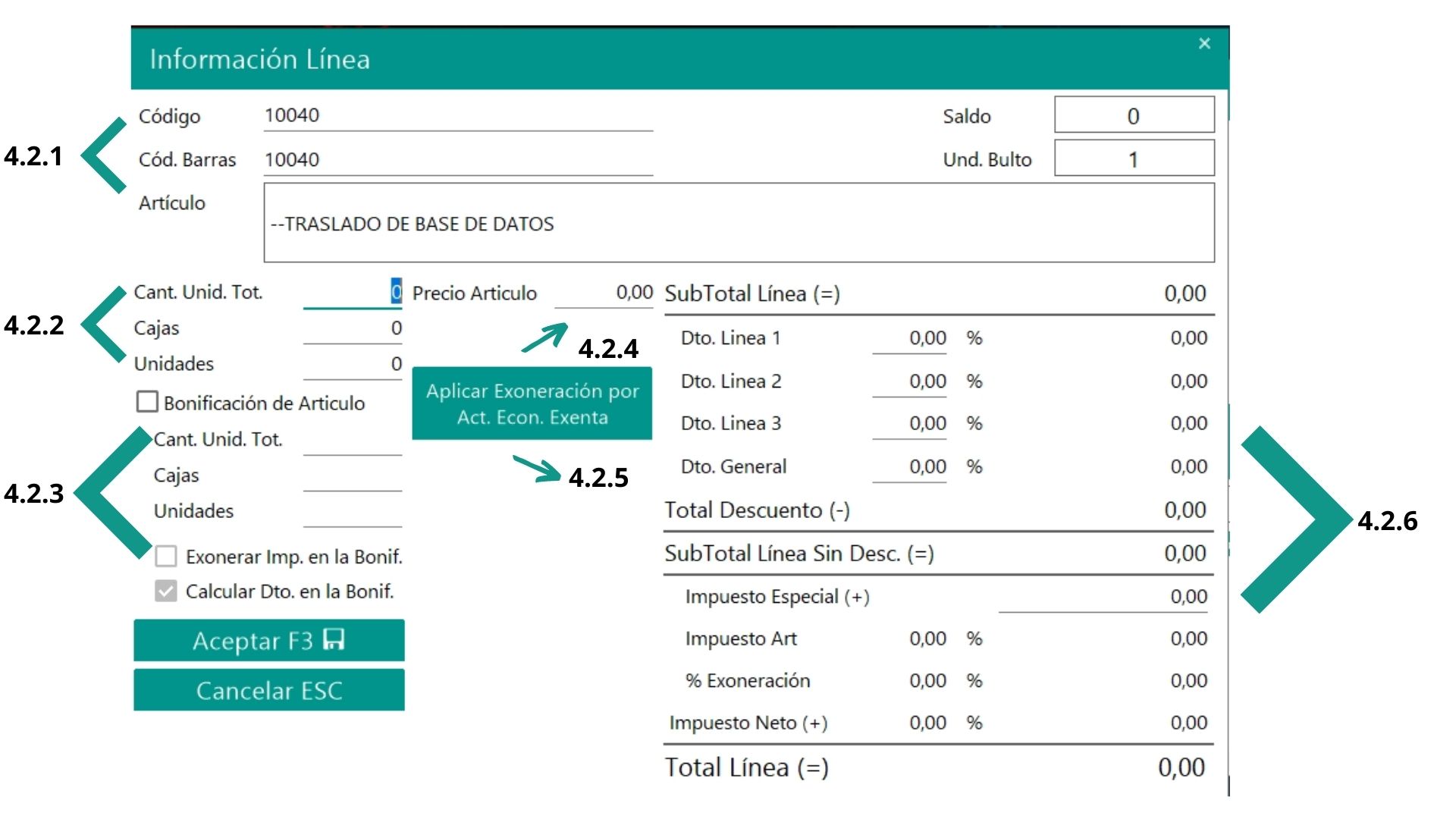4.2.5. Aplicar exoneración por actividad económica: Este Botón permite aplicar una exoneración de impuestos (deducir el impuesto que debe pagar el cliente al comprar ese articulo). La empresa(cliente) debe ser aprobada por el Ministerio de Hacienda para la deducción de impuestos de ciertos artículos, en este regimen no son todos los artículos que se pueden exonerar.