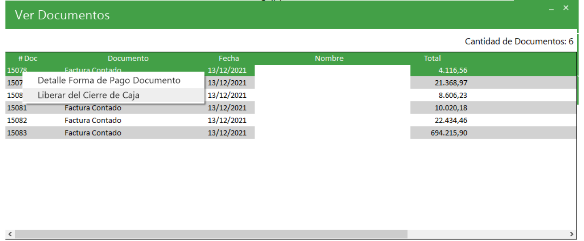 Para revisar los diferentes documentos de venta que realizo el usuario se presiona la carpeta, en ella se puede analizar el detalle de la forma de Pago del Documento (Si la factura se cancelo por sinpe, transferencia, tarjeta o efectivo) también el usuario puede liberar el documento del Cierre de Caja, para que el documento no sume al cierre. Esta opción solo funciona si el usuario tiene permiso para liberarlo.