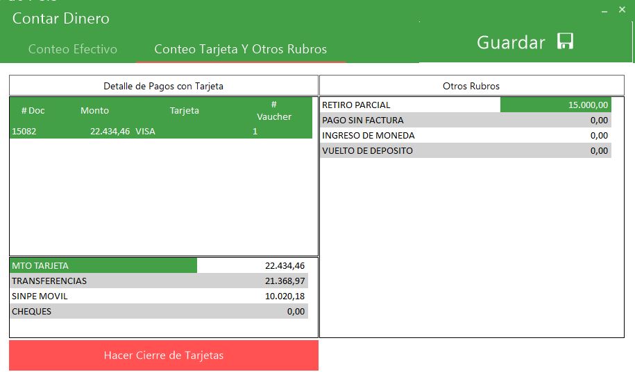En la segunda pestaña de Conteo Tarjeta Y otros Rubros, el usuario debe presionar el botón de «Hacer Cierre de Tarjetas» para que de forma automática, sume las facturas canceladas por medio de tarjeta, transferencia, sinpe y cheques.