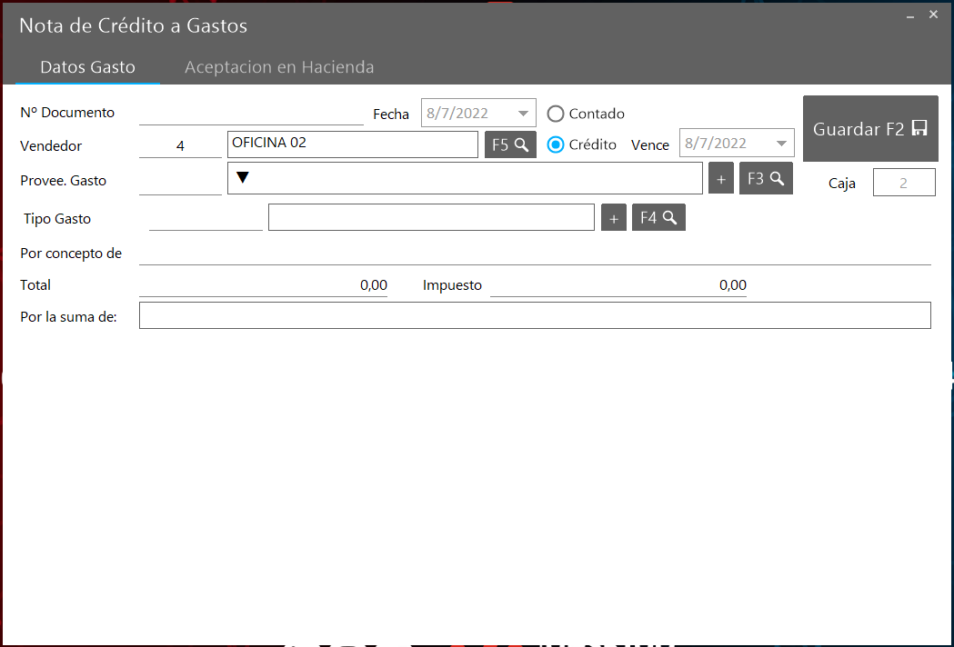 Nota de crédito de Gasto, es un documento que el proveedor de gasto debe crear con anterioridad para luego registrar en el sistema. Esta secuencia se realiza para obtener el consecutivo del documento original.