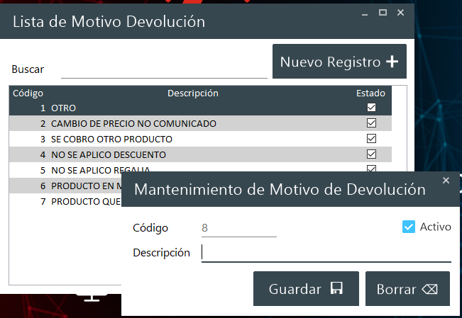Para crear un registro debe presionar el botón «Nuevo Registro +» donde podrá agregar la descripción, debe tomar en cuenta que el sistema no le permitirá agregar o duplicar una descripción que ya estuviera agregada previamente.