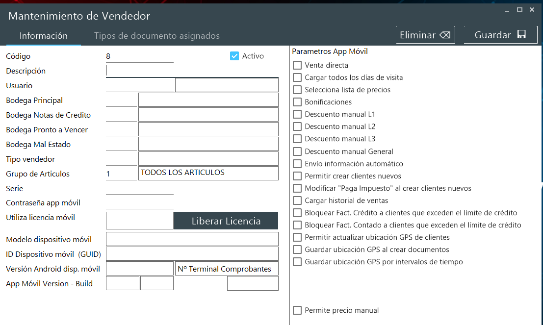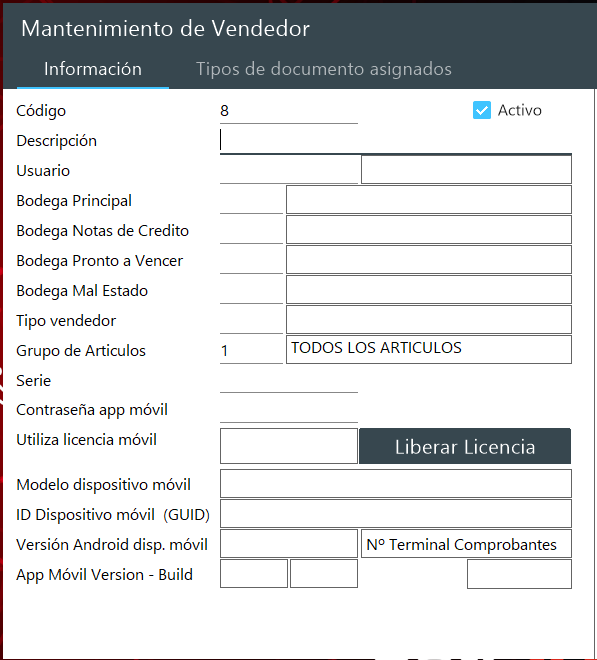 Utiliza licencia móvil: acá se cargan los datos del teléfono del vendedor cuando este recibe la carga móvil, con los datos del sistema.