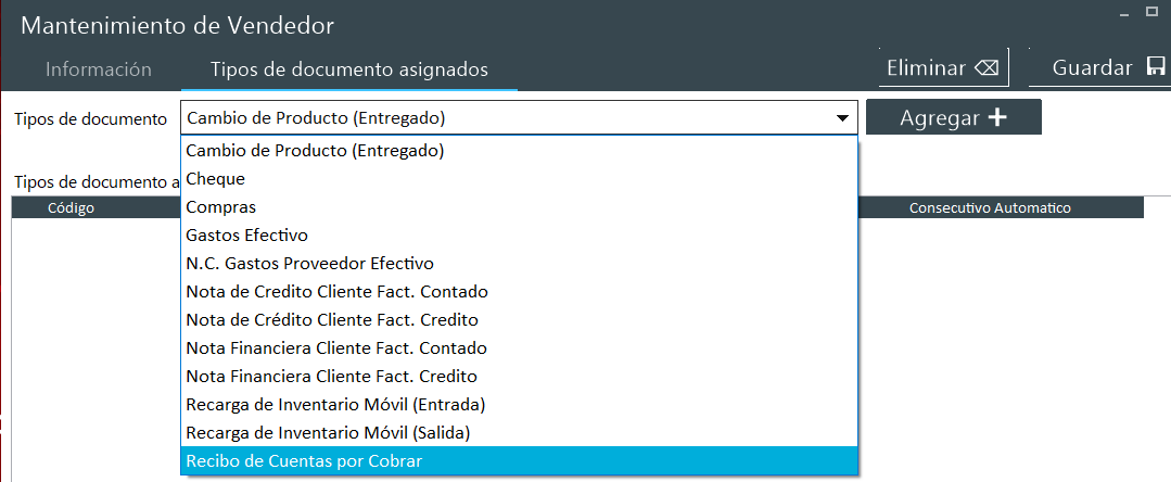 Tipo Vendedor: se elige si el vendedor es un vendedor de Oficina, Preventa, Venta Directa, Reparto o Cobrador.