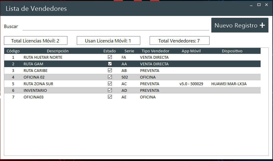En esta ventana puede observar cuantas licencias móviles puede utilizar la empresa, cuantas tiene en uso y cuantos vendedores están activos.