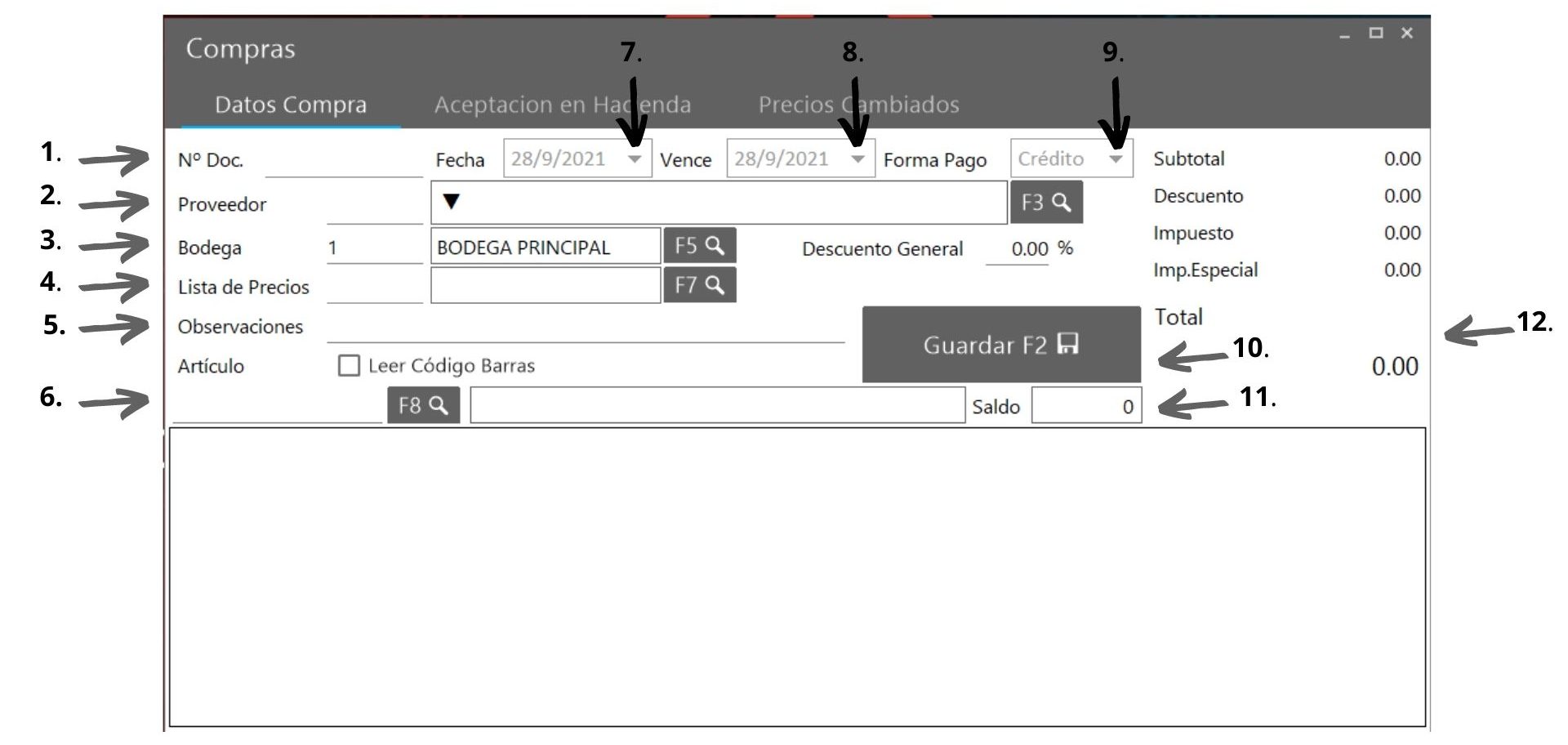 11. Saldo: Esta opción muestra al usuario el saldo real del articulo, sin contemplar aun las unidades de la compra que esta digitando.