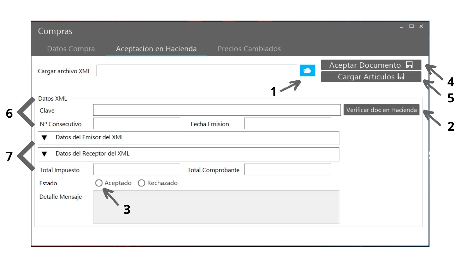 Estado, Aceptado, Rechazado y Detalle del mensaje. Se marca la opción de aceptar o rechazar el documento y en el campo de detalle el usuario puede escribir alguna nota al proveedor o en el caso de rechazar el documento, justificar el por qué del rechazado.