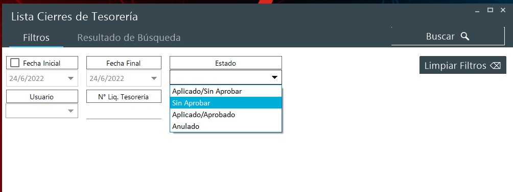 - Fecha inicial, fecha final: rango de fecha para buscar cuando se inicio la tesorería y cuando concluyo.
