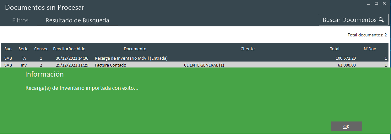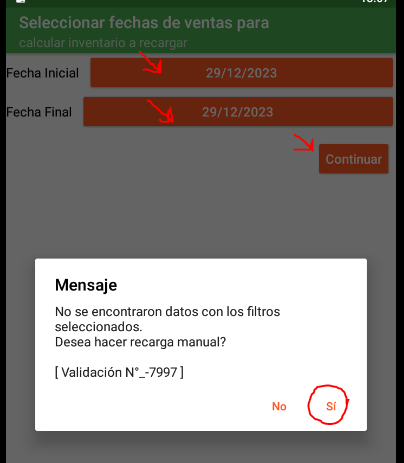 El sistema le mostrara un Mensaje: No se encontraron datos con los filtros seleccionados. Desea hacer recarga manual? NO. SI.