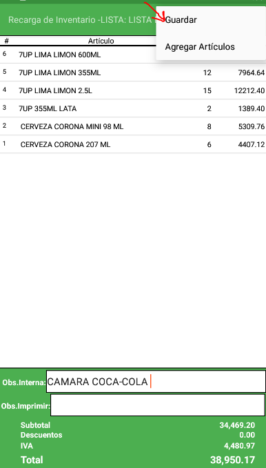 Al presionar los tres puntos de la aplicación en la parte superior derecha, la aplicación le mostrara dos opciones, el usuario deberá presionar la opción de ►Agregar Artículos◄