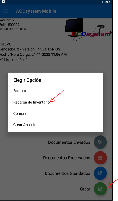 El usuario deberá ingresar a la aplicación, presionar las 3 rayitas que se encuentran junto al titulo de ACDsystem Mobile y presionar la opción de ► Recibir Carga de Información.◄
