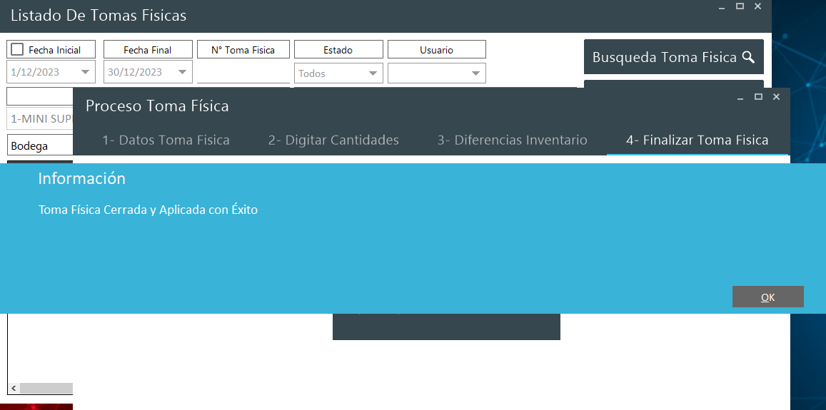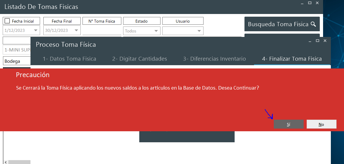 Después debe presionar el botón de aplicar y cerrar toma física y el sistema le mostrara una ultima advertencia para aplicar los cambios en el sistema, donde el usuario deberá presiona el botón ►SI