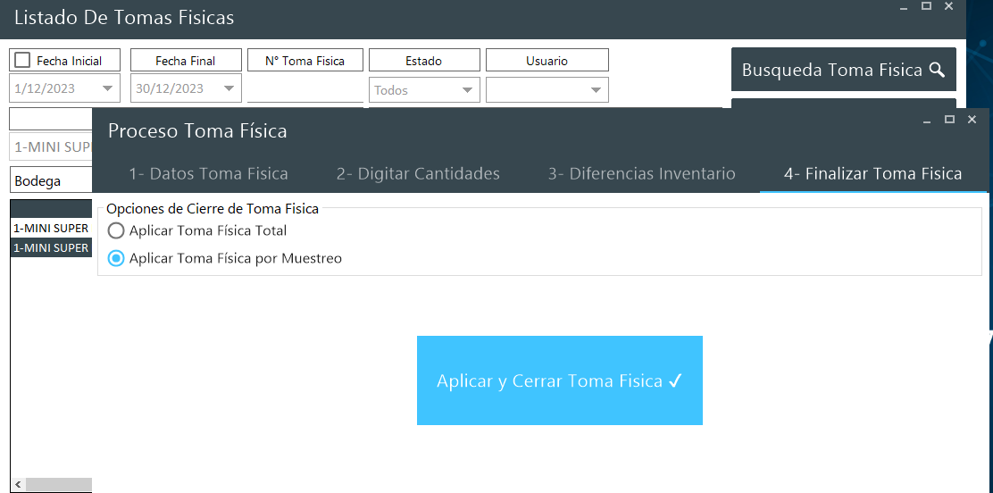 el usuario puede encontrar su conteo de inventario importado en la toma física el cual debe abrir nuevamente e ir a la ultima opción de ►Finalizar Toma Física◄ donde el sistema le solicita confirmar cual opción de cierre de toma física quiere aplicar, si ►TOTAL o por ►MUESTREO