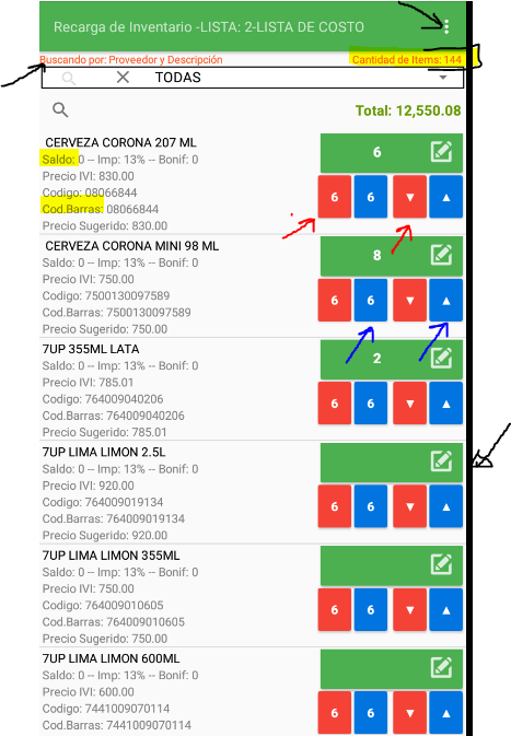 Después de seleccionar el tipo de búsqueda. Con ayuda de los botones azul, rojo y verde, podrá agregar la cantidad a cada articulo.