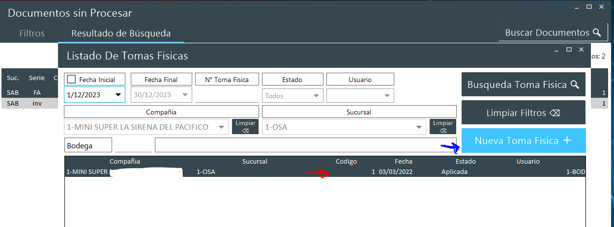 Si en la computadora(empresa) no hay abierta una toma física para importar el inventario el usuario debería presionar el botón de ►Nueva Toma Física +◄ como se muestra en la flecha azul; caso contrario si hubiera una toma física abierta, debe posicionarse sobre la linea y presionar doble clic para utilizar la toma física abierta como se muestra en la flecha roja.